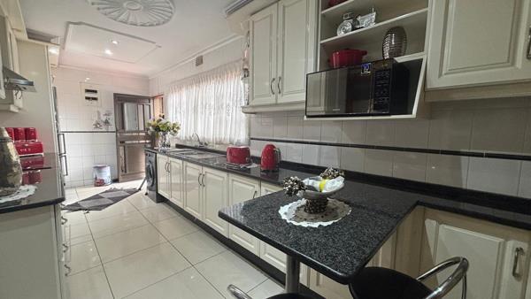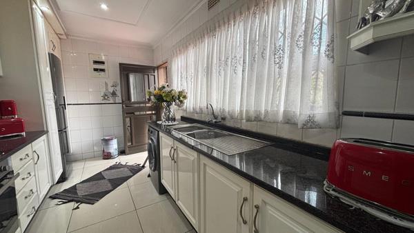 Inside the residence offers three comfortable bedrooms and two well-appointed bathrooms including an on-suite alongside a convenient guest toilet and an additional outside toilet. Living spaces are designed for comfort and entertainment comprising a lounge and a dedicated family TV room. Enjoy elegant touches like pressed ceilings, special doors and special lights with a cozy fireplace and a built-in bar adding to the home''s appeal. The well-appointed kitchen spaces feature ample white and cream cabinetry, dark granite countertops, built-in appliances including an oven, hob and range hood all complemented by practical tiled backsplashes and flooring.