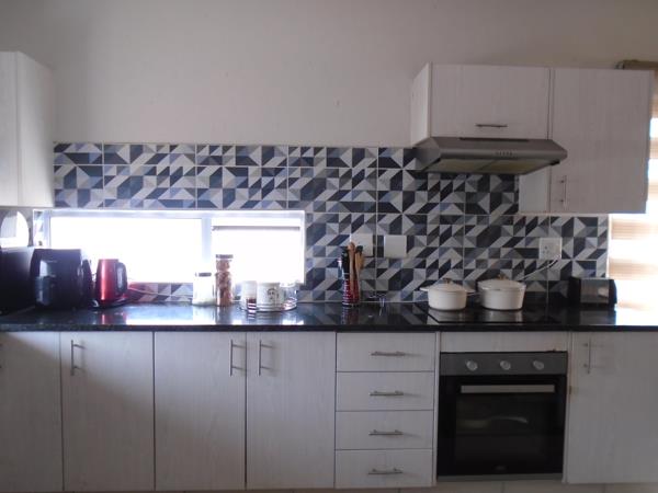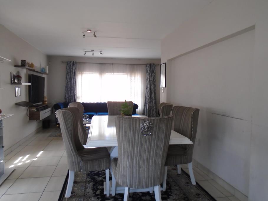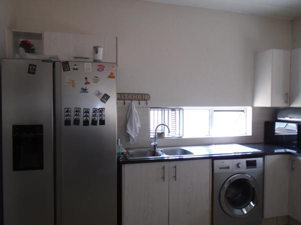 This lovely property boasts tiled floors throughout, a fully fitted kitchen, UCO & HOB, a Spacious lounge cum dining room, a sunny stairway, 3 bedrooms with built-in cupboards, 2 bathrooms (one en-suite) upstairs, and a drive-through garage.