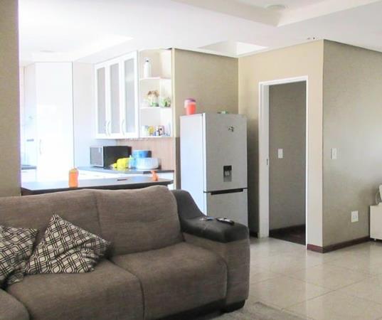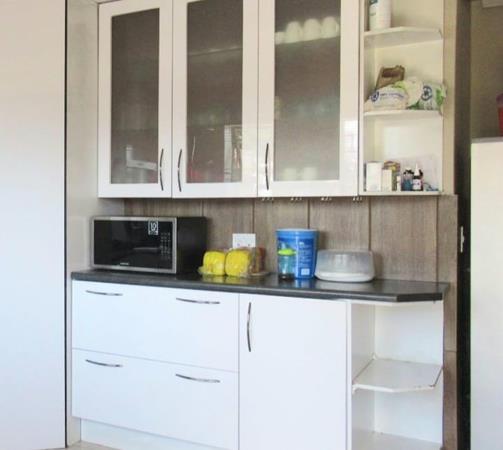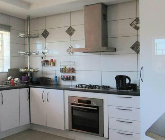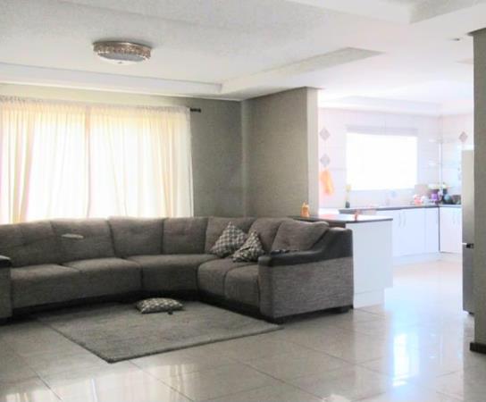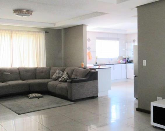 Open plan lounge and dining, leading into a modern, spacious kictchen with ample cupboards and space for appliances.