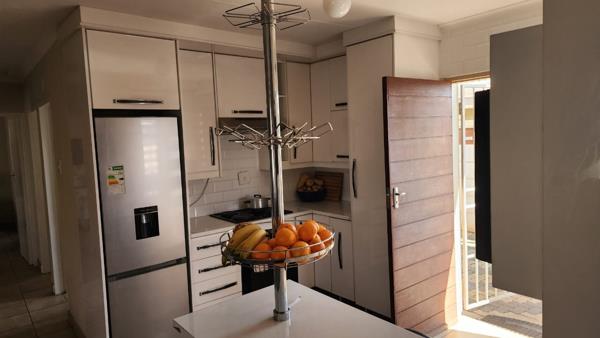 Outdoors, the property benefits from a private, totally walled garden area, offering a secure space for outdoor activities and potential for personalized landscaping. Sustainability is addressed with a solar geyser, contributing to energy efficiency. Security features include burglar bars on windows, providing peace of mind. Connectivity is ensured with fibre internet availability, and a satellite dish is also present.