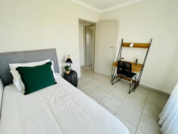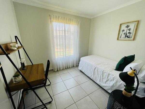 The home features three comfortable bedrooms each continuing the clean modern aesthetic with neutral tones and tiled floors. These practical spaces are designed for rest and personal retreat with one bedroom thoughtfully arranged to include a dedicated workspace catering to modern needs. The property further benefits from two well appointed bathrooms providing ample convenience and privacy for all residents.