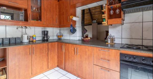 The main bathroom is designed for convenience, featuring a combined bath and shower, a hand basin, and a toilet, all elegantly tiled. Cook up a storm in the airy kitchen, complete with an abundance of built-in cupboards, ensuring meal prep is both easy and enjoyable.