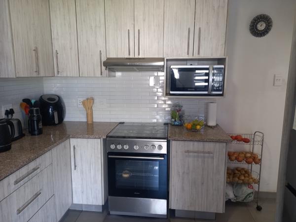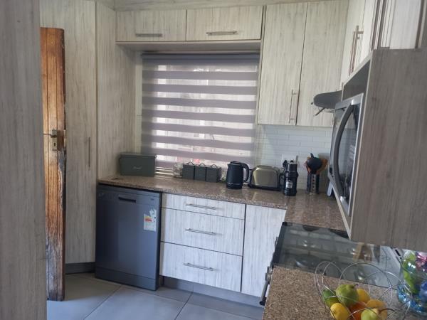 Lovely three bedroom home. All the bedrooms have built in cupboards. There is one bathroom comprising of a shower, toilet and basin. In addition a guest toilet. The front of the home has a lovely covered patio area. This is ideal for catching the sun and entertaining guests. You enter the cozy lounge which is beautifully tiled. There is a brand new kitchen with gas stove to cook up a storm.