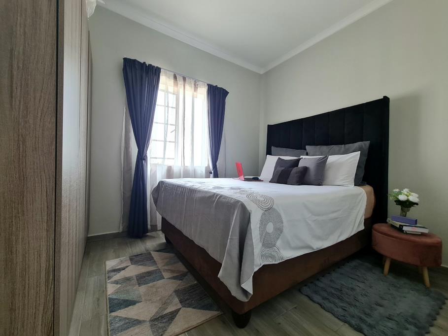 Main bedroom: tiled, built-in cupboards, curtain rail