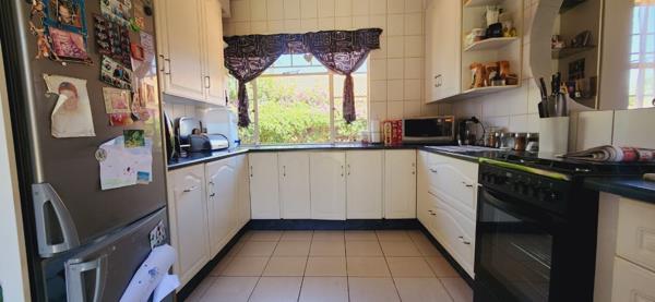 Inside, a functional layout awaits. The kitchen, with white cabinetry and dark countertops, benefits from abundant natural light and a garden view, offering ample storage and counter space. It flows openly into the adjacent living and dining areas via an archway. A spacious lounge and a dedicated family TV room provide versatile spaces. Additional features include a braai room and a built-in bar, perfect for hosting. An entrance hall welcomes guests.