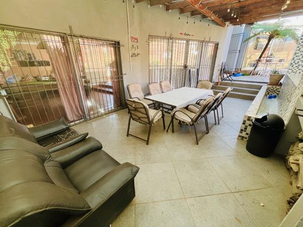 Outdoor Living: Covered patio with built-in braai, overlooking a beautiful pool with a water feature