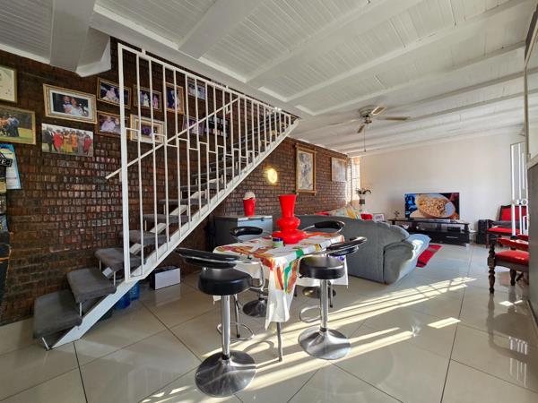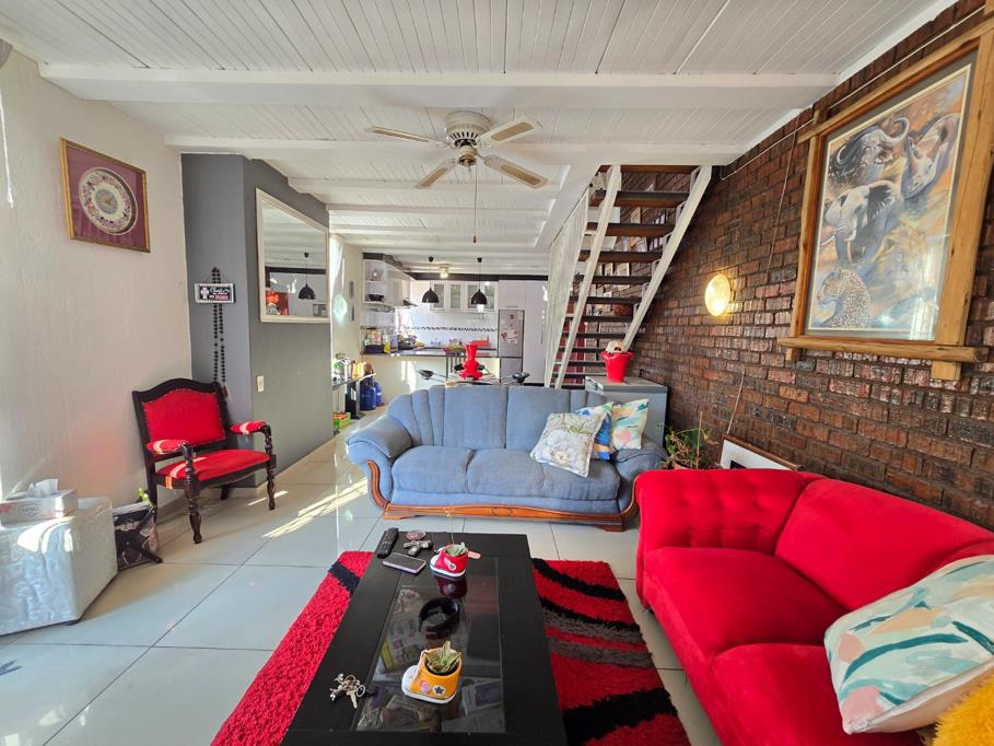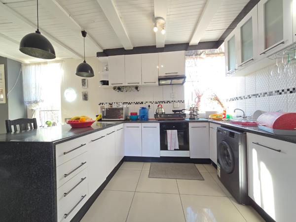 Upon entering, you are greeted by a stylish modern kitchen featuring ample cupboard space, granite countertops, a 4-plate electric stove, oven, extractor, and a dedicated fridge space. The kitchen flows seamlessly into the open-plan dining and lounge area, creating a warm and inviting space for both everyday living and entertaining guests.