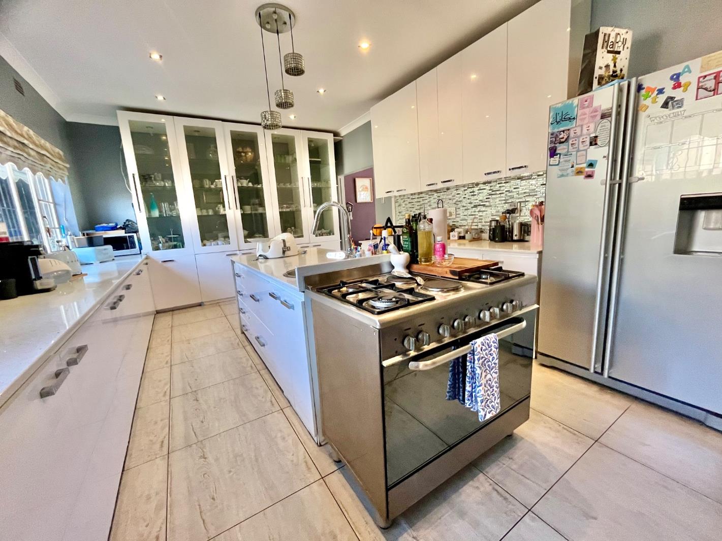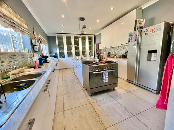 Step into a bright, open-plan living and dining area that flows seamlesslyideal for entertaining or relaxed family time. The stylish kitchen is a standout, featuring Caesarstone countertops, a central island, sleek cabinetry with glass display units, a gas hob, and a separate scullery for added practicality.