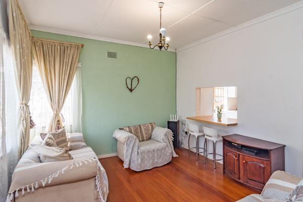 Homely lounge leading to an open-plan, tiled kitchen.