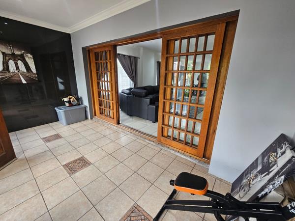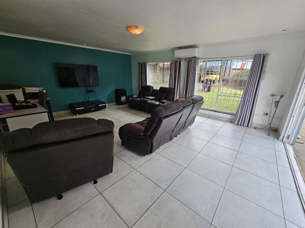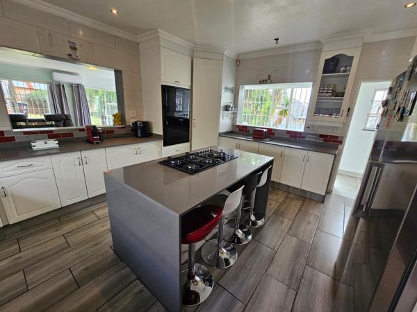 The bedroom wing is thoughtfully laid out, with four spacious bedrooms, each fitted with built-in cupboards and air conditioning. The master suite exudes luxury with its private en-suite, offering a bath, shower, toilet, and basin. A second modern bathroom serves the additional bedrooms, ensuring convenience for the whole family.