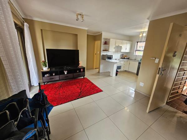 Large tiled open plan Lounge and Kitchen. Lounge opening onto balcony with build in braai and great views.