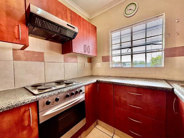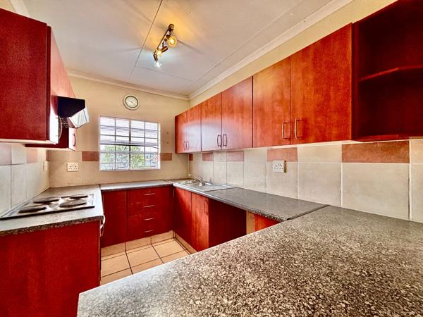 Discover comfortable living in this well-appointed 77 sqm apartment, ideally situated within a secure complex in the suburban heart of Winchester Hills, Johannesburg. This inviting residence features a functional layout designed for ease and convenience, comprising two bedrooms, one bathroom, a dedicated dining room, and a spacious lounge. The kitchen is a highlight, boasting a practical U-shaped design with ample reddish-brown cabinetry, granite-look countertops, a tiled backsplash, and a double stainless steel sink. It comes equipped with a built-in oven, hob, and extractor fan, complemented by natural light from a window.