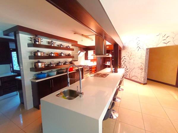 Overlooking a scenic view of the sparkling pool, the gourmet kitchen is the true heart of this home. Featuring Caesar Stone countertops, two breakfast islands, and a skylight that bathes the space in natural light, it inspires culinary creativity. The kitchen is complemented by a scullery, and a dedicated laundry room, and domestic quarters, within a private courtyard.