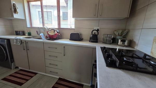 Step inside and be welcomed by open-plan tiled living spaces designed for style, comfort and easy maintenance. The contemporary kitchen is a true highlight boasting a modern layout, dual electric and gas stove plates for uninterrupted cooking, electric oven, ample cabinetry and dedicated space for your washing machine and fridge. A convenient breakfast counter flows seamlessly into the dining/ lounge area flooded with natural light and with a fitted TV stand and floating shelves creating a warm and inviting atmosphere.