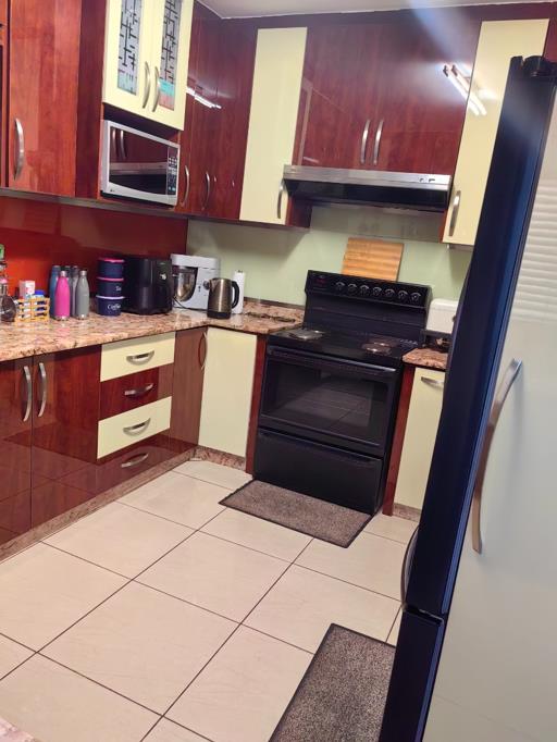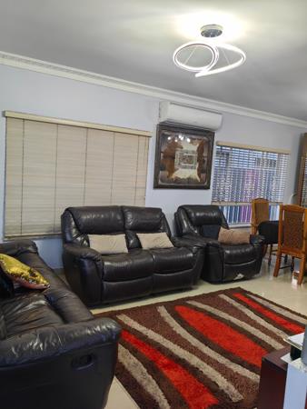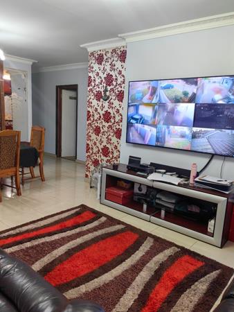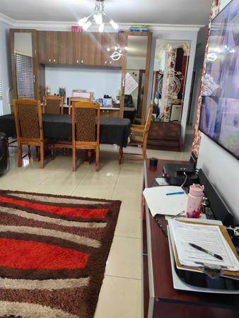 Discover this inviting four-bedroom family home situated in the vibrant community of Lenasia South, Johannesburg. The residence features a spacious combined living and dining area, perfect for family gatherings and entertaining. Tiled flooring flows throughout these communal spaces, complemented by a large custom-built wall unit with integrated mirrors, enhancing the sense of space and providing extensive storage. The modern kitchen is a highlight, boasting stylish dark wood cabinetry, durable granite countertops, and a contemporary black French door refrigerator. A distinctive red backsplash adds a touch of character, while an exterior door with security bars ensures both natural light and peace of mind.