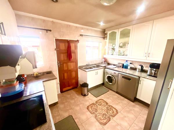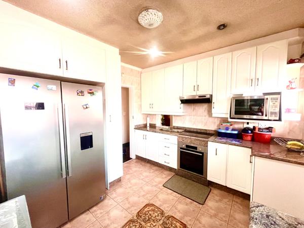 A double automated garage equipped with fitted cupboards for extra storage. Additional parking space available for up to five cars ensuring convenience for family and guests. Comprehensive security features include an electric fence, an automated gated entry with burglar bars and a reliable alarm system all within a gated community for added peace of mind.