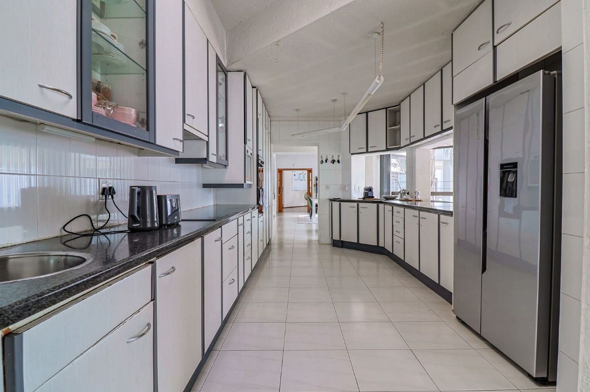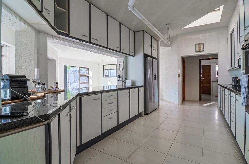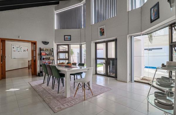 At the heart of the home lies a fully fitted modern kitchen, complete with premium finishes, ample cabinetry, and a separate scullery to ensure effortless entertaining. The dining area extends onto a charming patio overlooking the sparkling swimming pool, offering a serene backdrop for relaxation or alfresco gatherings with family and friends.
