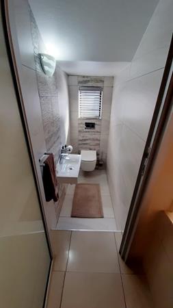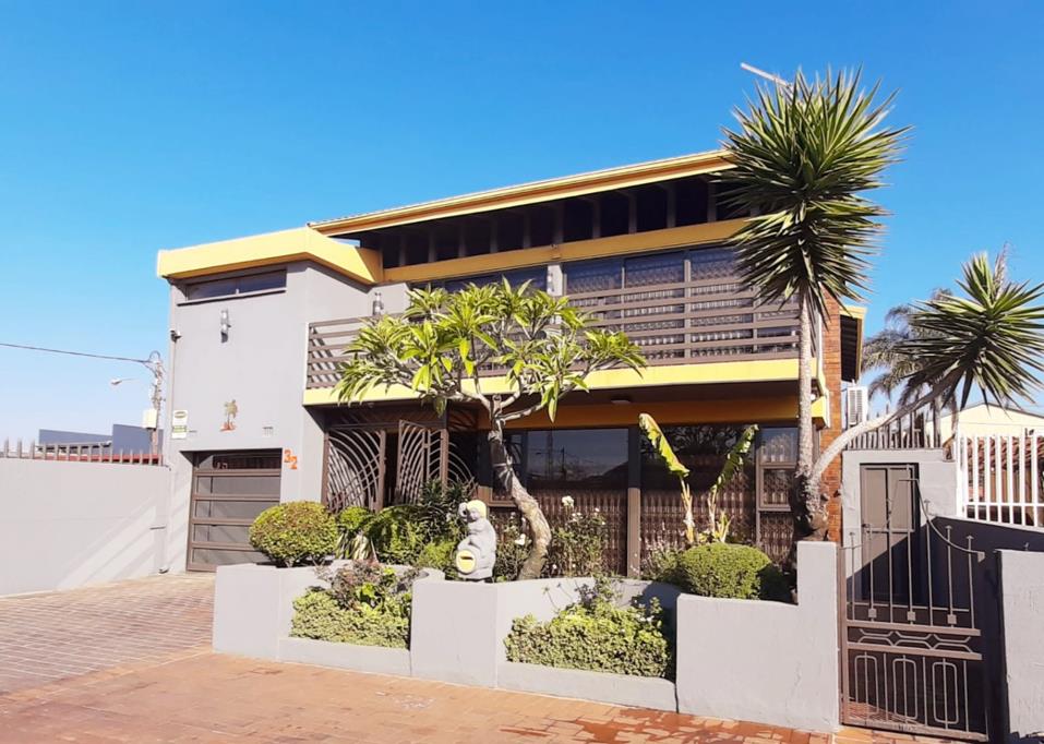 A secured and remote operated gate welcomes one into a tiled area leading into the porcelain tiled and trelligated entrance hall. An elegantly tiled staircase goes up to the top floor. The large, bright and airy lounge to the right has a gas fireplace and a modern TV/entertainment unit. Adjacent to the staircase is a guest toilet having modern fittings and finishes. There is a smooth flow from the entrance hall into the spacious dining room with wooden cabinetry which then flows into a ''dream kitchen''. The kitchen has loads of storage space in cupboards having ''oak'' finishes and countertops are of black granite. An eight place granite table is a fixed fitting and the adjacent scullery with yet more cupboard space compliments the kitchen.