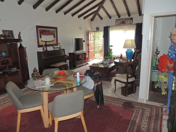 Open-plan flows through lounge and dining room to well fitted kitchen. Breakfast nook, under counter oven and hob with extractor. Space for dishwasher. Three good sized bedrooms, can take queen size beds. Ample built-in cupboards. Double linen cupboard in passage. Two bathrooms, en-suite has shower and bath.. A separate laundrystoreroom offers sufficient space for washing machine, tumble dryer and storage cupboards.