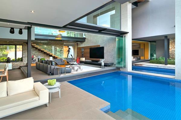The spacious lanai accommodates a braai, bar and seating area making it ideal for entertaining while the swimming pool is integrated into the design of the lanai, extending beneath the cantilevered floor slabs. Additional features include a firepit, staff accommodation, solar and wooden floors.