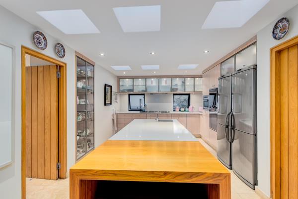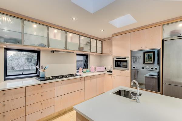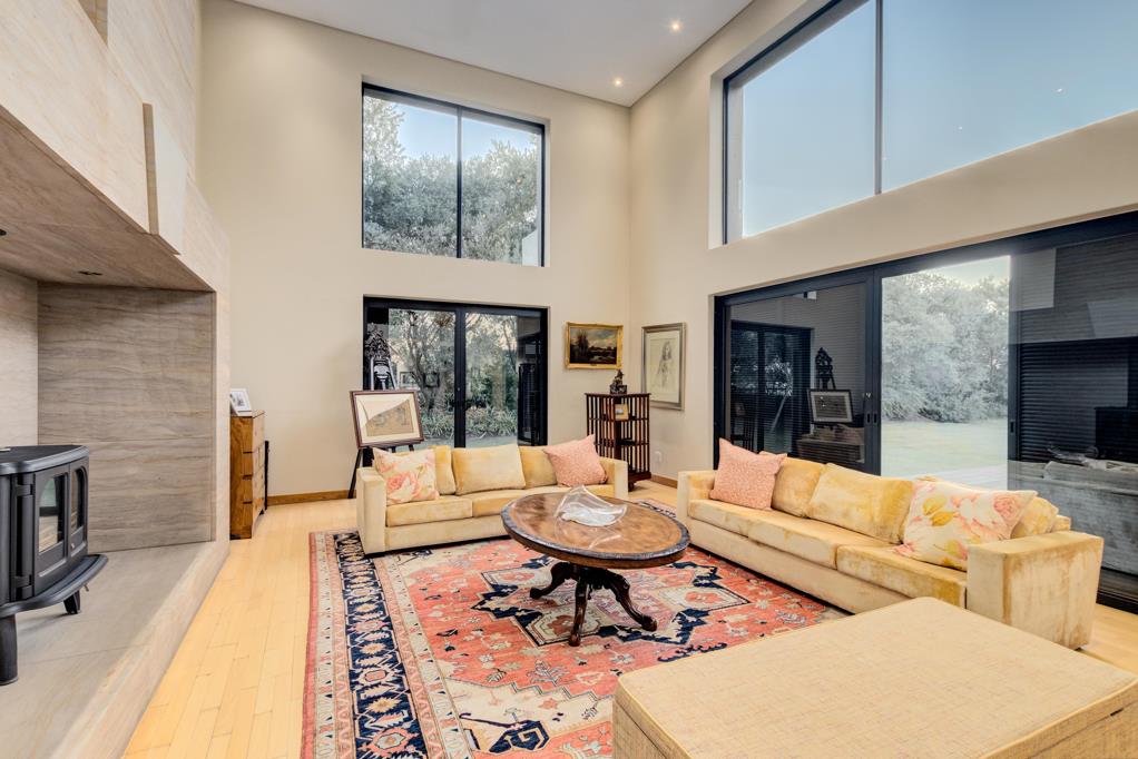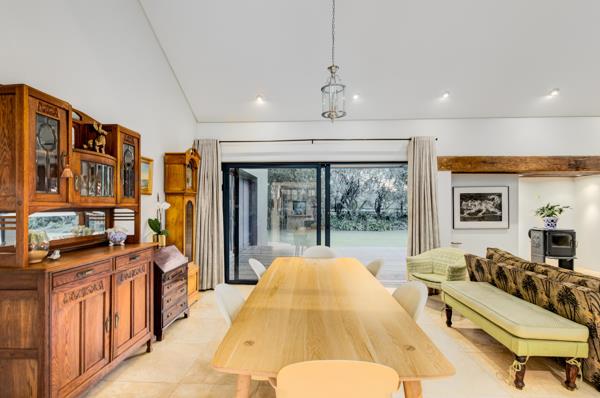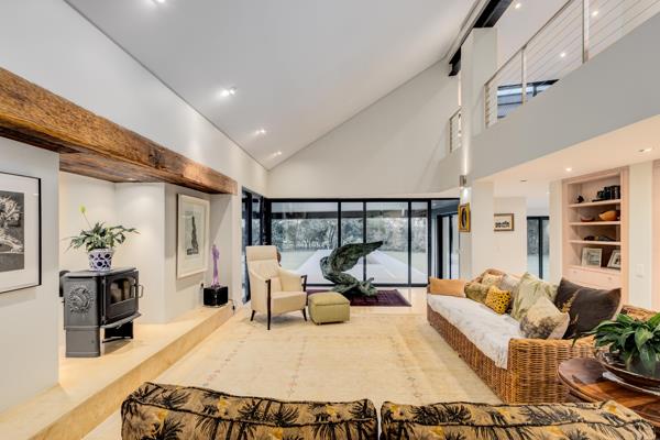 Inside, there are four generous bedrooms (one conveniently downstairs), multiple lounges to spread out in, and a home office that feels more like a watchtower because of its central position in the high volume gallery like space. The kitchen is bright and designed for real cooking complete with a Smeg gas hob, electric oven, walk-in pantry and large laundry/scullery leading onto the courtyard and double staff quarters. Theres a huge built-in bookcase waiting for your favourites and a high-volume entrance that makes every arrival feel like a statement. A Morso fireplace warms up the central living spaces with ease during the cooler months.