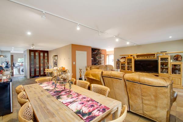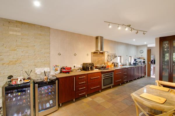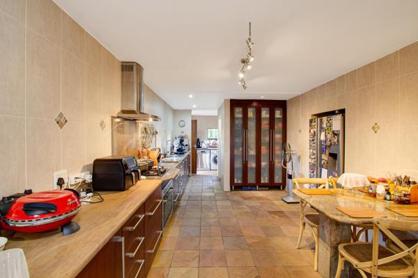 Large well fitted open plan gourmet kitchen with Namibian sandstone, breakfast bar and separate scullery laundry with space for all appliances. Space for double fridge, gas hob, prep bowl. Walk-in pantry.