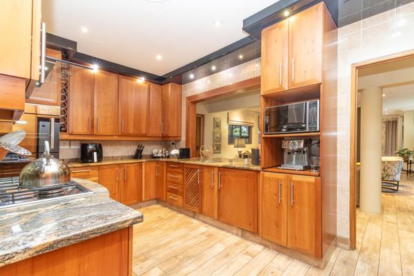 Step inside and be captivated by the spacious, open-plan kitchen featuring luxurious granite countertops, elegant cherrywood cabinetry, a double oven, hob, and space for a double-door fridge. The breakfast nook invites casual dining, while the separate scullery and laundry add practicality and convenience.