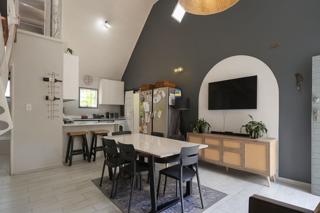 From the moment you enter, youre welcomed by double-volume ceilings and an abundance of natural light that instantly create a sense of space and calm. The open-plan layout flows seamlessly through the dining and living areas into a bright, modern white kitchen with ample cabinetry, a gas hob, breakfast nook, and space for two under-counter appliances, perfect for busy mornings or relaxed family meals.