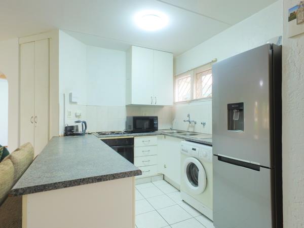 The compact kitchen features ample cupboard space, generous counter tops, a hob and under-counter oven, a double sink, and space for one under-counter appliance and a single-door fridge.