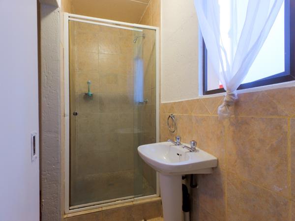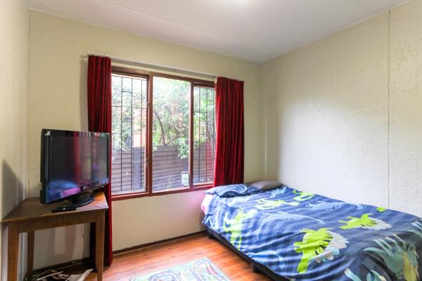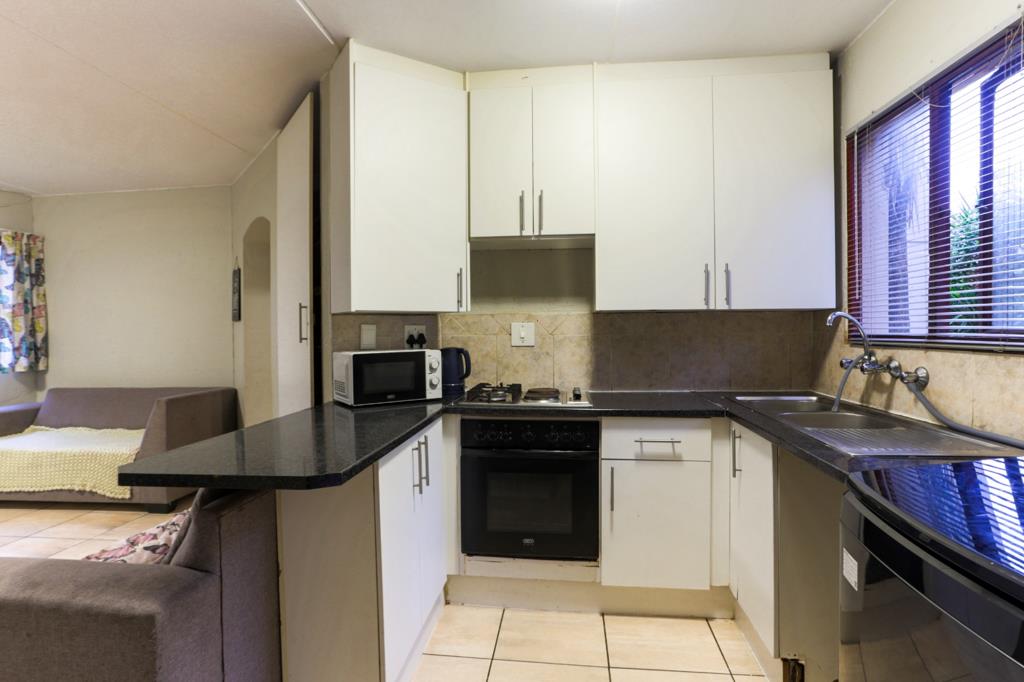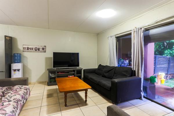 The open-plan kitchen features an electric and gas hob, double sink with ample cupboard space, flowing seamlessly into a bright and airy living area. Step through to the covered patio with built-in braai facilities, overlooking a quaint garden, an ideal space for relaxed outdoor living and entertaining.