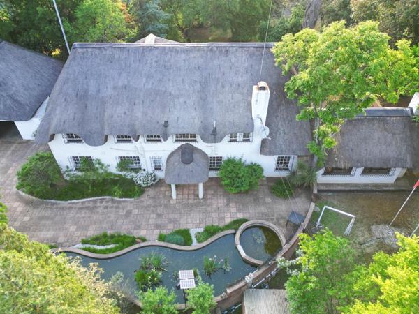A beautiful double-story home with a thatched roof, offering a classic, rustic country aesthetic.