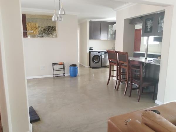 Durable concrete flooring in the living areas, kitchen, dining, and hallway