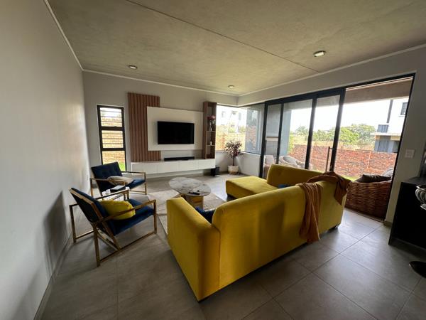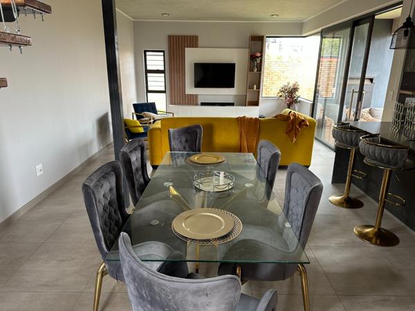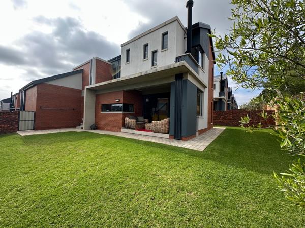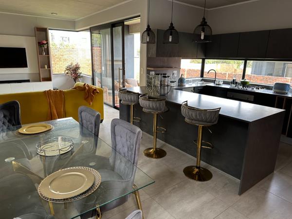 The heart of the home is the expansive open-plan lounge, dining area, and modern kitchen, seamlessly flowing out to a covered patio with a built-in braai perfect for indoor-outdoor entertaining. The kitchen is a chefs dream, equipped with a gas hob, generous workspace, and a separate scullery plumbed for two wet appliances with space for a double-door fridge.