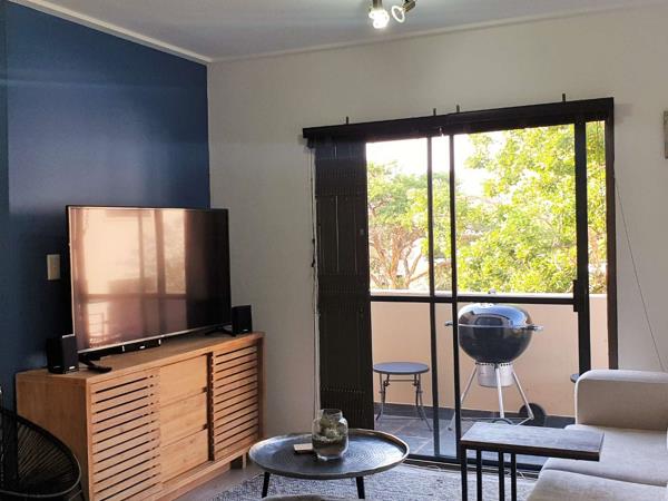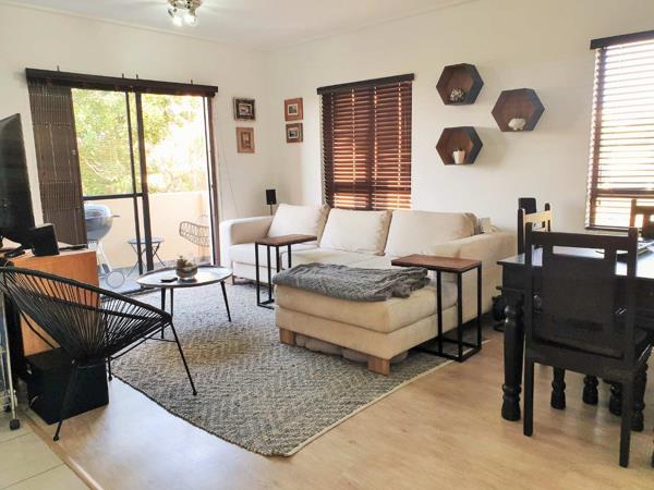 The floor and wall tiles are done in neutral tones, enhancing the contemporary feel. The reception area has space for a dining table & a lounge with a sliding door opening onto a balcony that overlooks the estates lush gardens. Sash and vertical aluminium picture windows framed maximize the views and natural light, while Venetian wood blinds and wood-look vinyl floors add warmth and elegance.