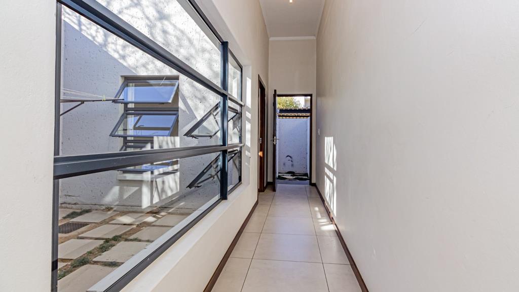 Spacious North facing 3-bedroom, 2-bathroom Row house with a double carport with views of the Magaliesburg Mountains. The unit has an atrium, covered patio and built in cupboards. The kitchen has a Miele oven and stove. Space for 2 wet appliances, living areas are tiled with carpets in the bedrooms.