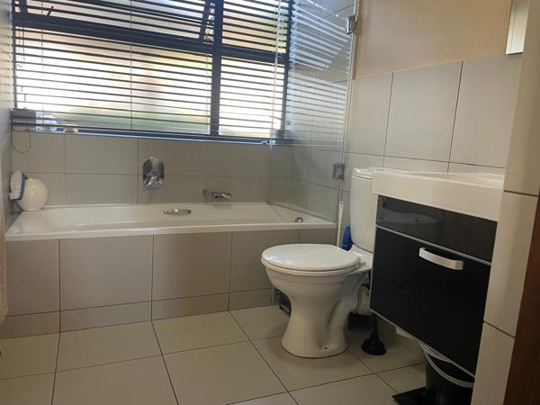 The unit includes two well-sized tiled bedrooms. The bathroom offers a shower-over-bath setup for convenience.