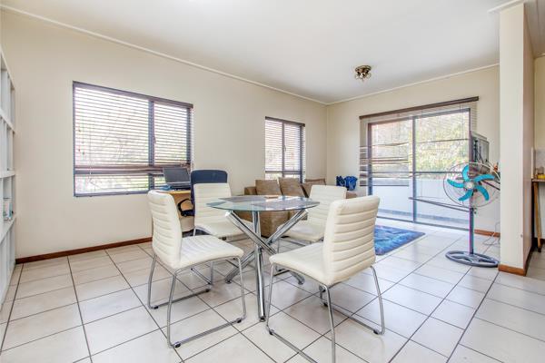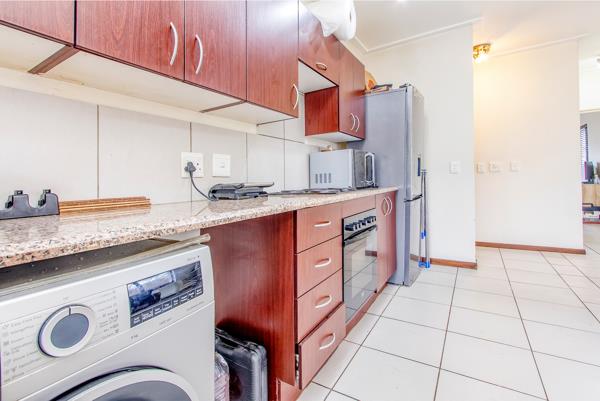 The apartment features a spacious open-plan living and dining area that flows seamlessly into a modern kitchen with ample cupboard space and quality finishes. Both bedrooms are generously sized, with built-in cupboards and plenty of natural light. The bathroom is contemporary, neat, and functional.