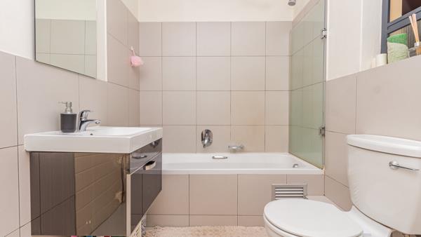 This well-maintained 2-bedroom, 1-bathroom first-floor apartment offers comfortable, secure living with a private patio accessed via a sliding door fitted with a security gate. The separate mahogany kitchen features granite countertops, a Miele oven, Hansgrohe taps, and space for one wet appliance. Tiled floors in the lounge and kitchen make for easy upkeep, while the bedrooms are carpeted for warmth. The bathroom includes a bath, basin, toilet, and shower-over-bath combo.