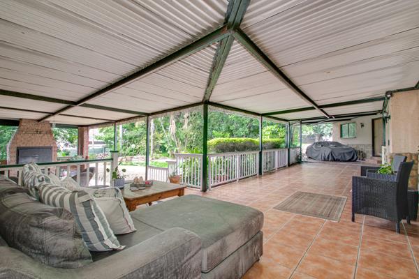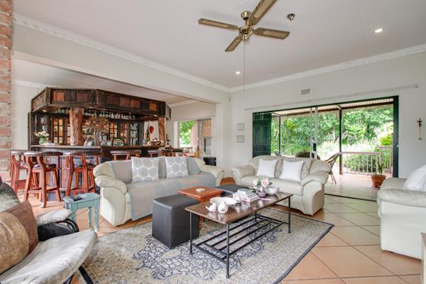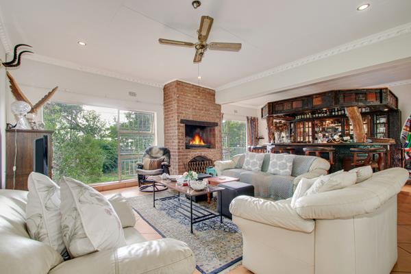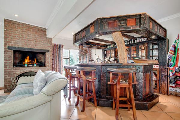 Step inside to a spacious lounge featuring a built-in fireplacebraai and a large Rhodesian Teak bar, all flowing seamlessly onto the covered patio for effortless indooroutdoor living.