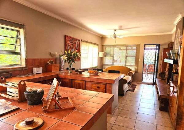 Gourmet farm style sunny kitchen with large gas stove and extractor fan, ample counter tops space, separate scullery and walk-in pantry. Back kitchen door leads outside to extensive vegetable garden and underground cellar. The kitchen is open plan to the dining room enjoying the double-sided fireplace. Door leads from dining area to the covered terrace.