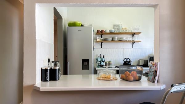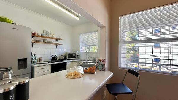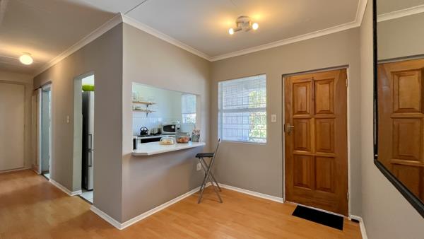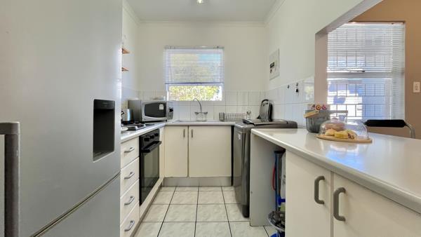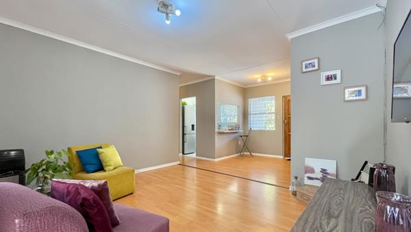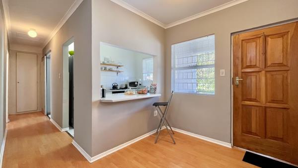 The spacious lounge, adorned with sleek laminate floors, seamlessly opens onto a generously sized balcony perfect for relaxing or entertaining guests in style. Two airy bedrooms with ample built-in cupboards and matching laminate floors offer both space and practicality. The beautifully
