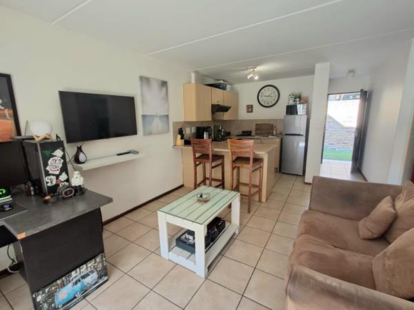 The open-plan kitchen and lounge area create a welcoming atmosphere, perfect for entertaining or relaxing. A sliding door leads from the lounge to a private patio, offering a seamless transition to the communal garden area where you can enjoy the outdoors.
