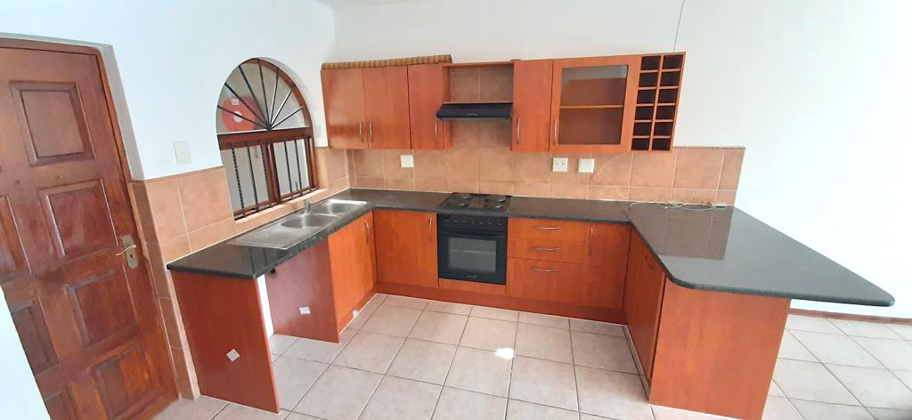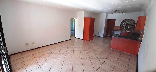 Open plan beechwood and granite kitchen with place for 2 appliances plus fridge leads to dining and lounge area and out to covered patio with built in braai and communal garden.