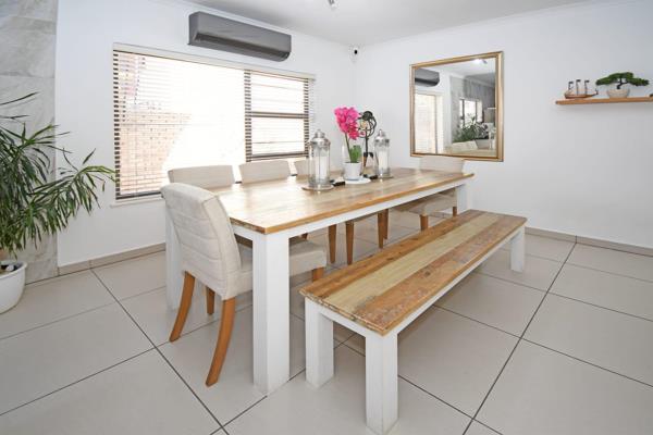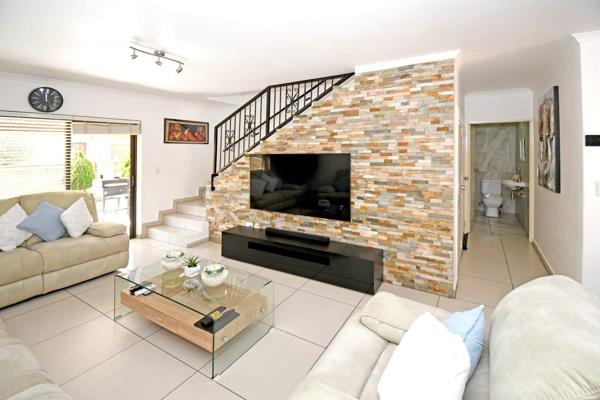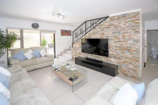 The spacious lounge and dining area feature elegant pure stone cladding, creating a sophisticated and comfortable atmosphere. The fully covered patio, enclosed with high-quality roll-up blinds, allows you to entertain or relax in all weather conditions, while the tranquil garden includes a peaceful waterfall feature and a fenced-off playpen for pets. Two additional vehicles can park inside the yard.