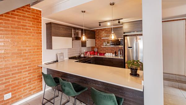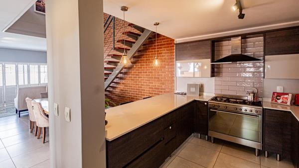 Downstairs, youre welcomed into a bright and spacious open-plan living area, featuring an ultra-modern kitchen with a separate scullery for added convenience. The kitchen offers ample Caesarstone countertops and cupboard space, accommodates a double-door fridge, and is equipped with a gas hob and undercounter space for three appliances.
