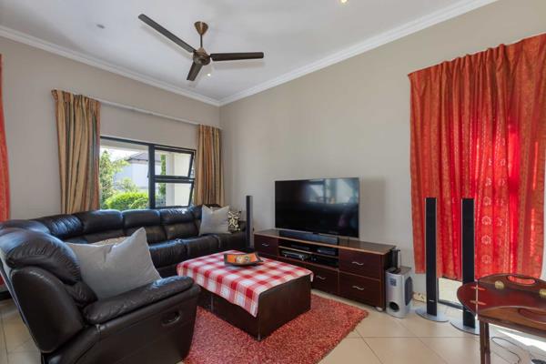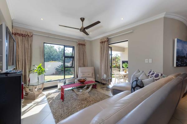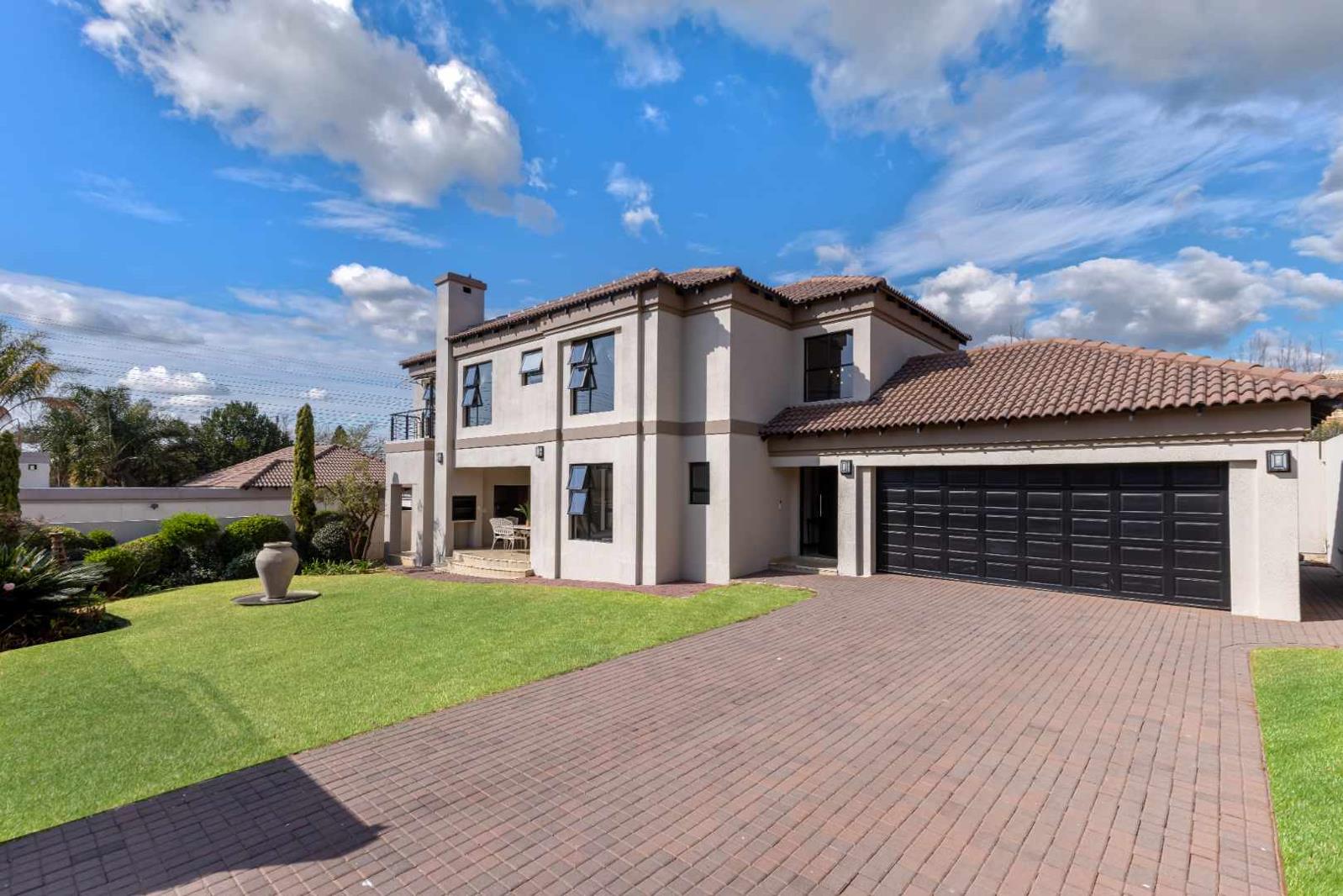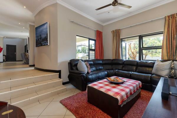 Welcoming entrance hall flows onto an open plan formal lounge and dining area, spilling onto a covered patio with a built-in braai, overlooking the sizeable manicured garden. The sunken family lounge is in quiet spot and is ideal for the family members to relax and unwind in. Spacious fitted kitchen with granite counter tops, single door fridge space, breakfast bar, double door fridge space, prep-bowl, electric stove and oven with extractor fan, separate scullery area that can accommodate under counter space for 2 appliances plus ample built-in cupboards space. Guest cloakroom completes the downstairs floor plan.