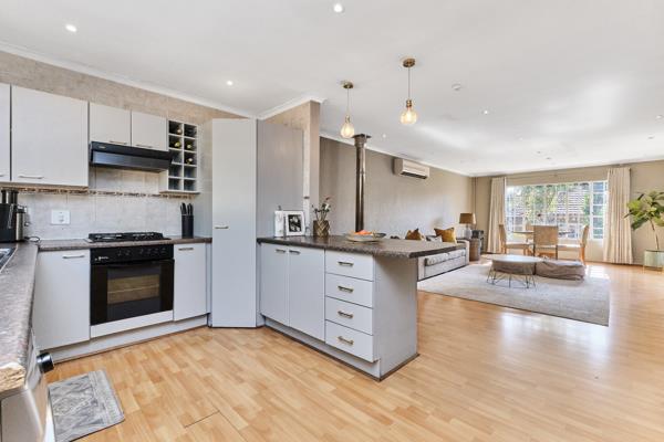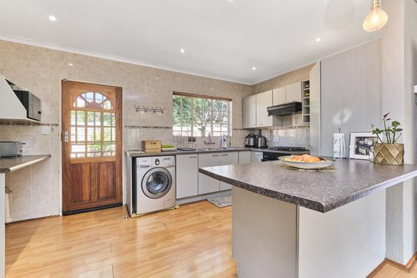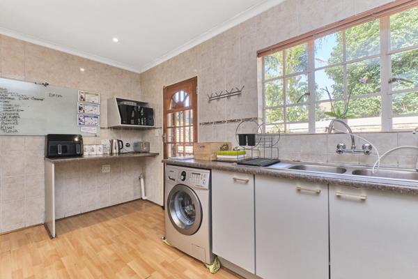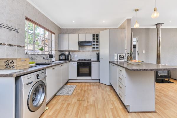 Spacious Kitchen with allowance for two appliances and space for a double door fridge. Plenty of Cupboard space and working area. The kitchen overlooks the lounge and dinning area for the family still interact. Leading out onto the manicured garden with covered Patio with pool.