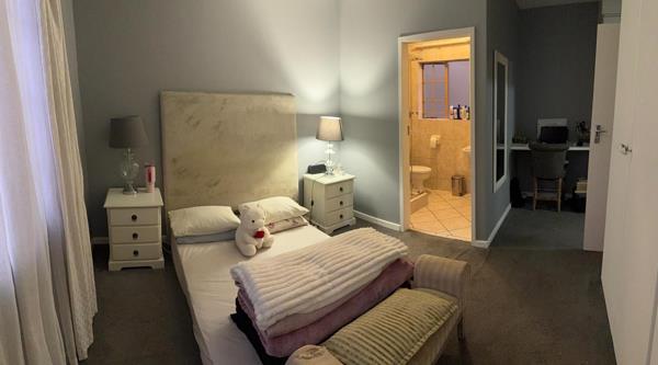 The main bedroom features a luxurious ensuite bathroom complete with a bathtub, toilet, and sink as well as a dedicated study corner, ideal for remote work or quiet reading.