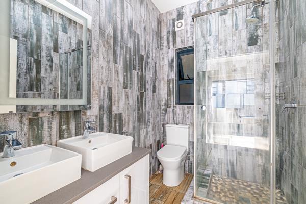 Comfort is paramount in the three well-proportioned bedrooms, each boasting modern wood-look tiled flooring and ample natural light. Built-in wardrobes with sliding doors provide practical storage. The two bathrooms are equally stylish, showcasing modern wood-look tiled walls and floors, double vessel sink vanities with illuminated mirrors, and a glass-enclosed shower with a distinctive pebble floor.