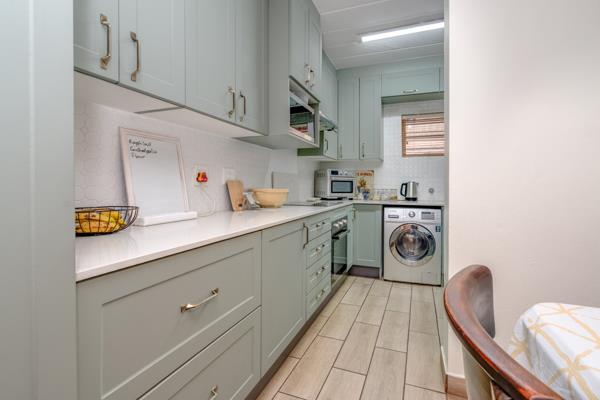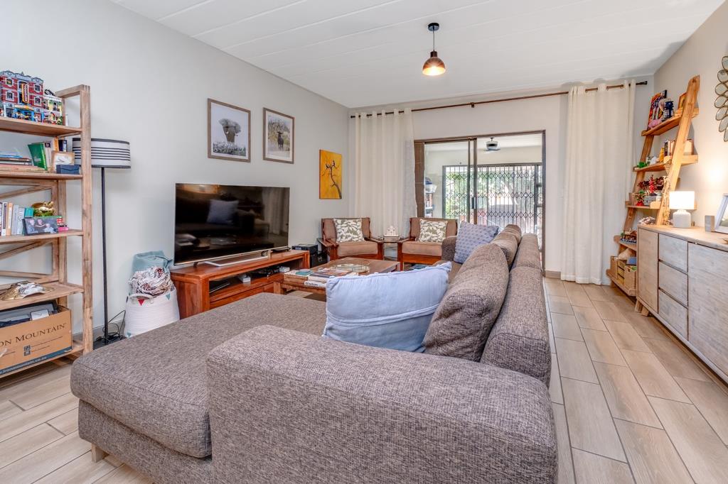 The lounge opens onto a covered patio that can be used as a spacious study, a kids play area, or an outdoor dining spot. Sliding doors lead to a private garden with a built-in braai and a convenient storeroom, ideal for entertaining or simply relaxing outdoors.